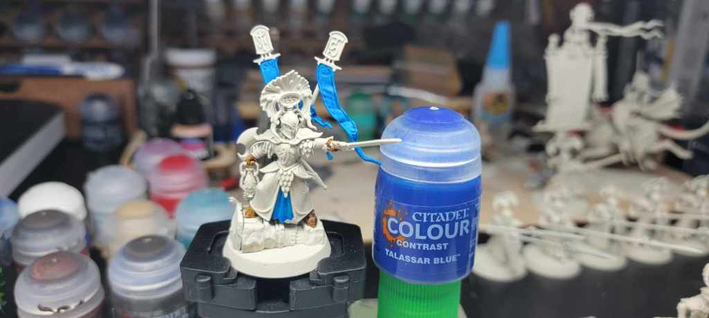In my long journey to conquering white painted armies and making them look good, I have learned a lot through the three things I have shared. Now I will get into the nitty gritty details of the paints and materials I used for my current Lumineth Realm Lords that have been working for me so far. My two big heavy lifters white paint wise have been Citadel Colour Wraith Bone spray primer and Citadel Colour Wraith Bone Base. After priming white I was able to fill in any missed gaps by dry brushing with the Wraith Bone Base. But also dry brushing certain areas of the model like the shields, chest plates and shoulder pads, it helped to add a little depth and also give them an additional pop.